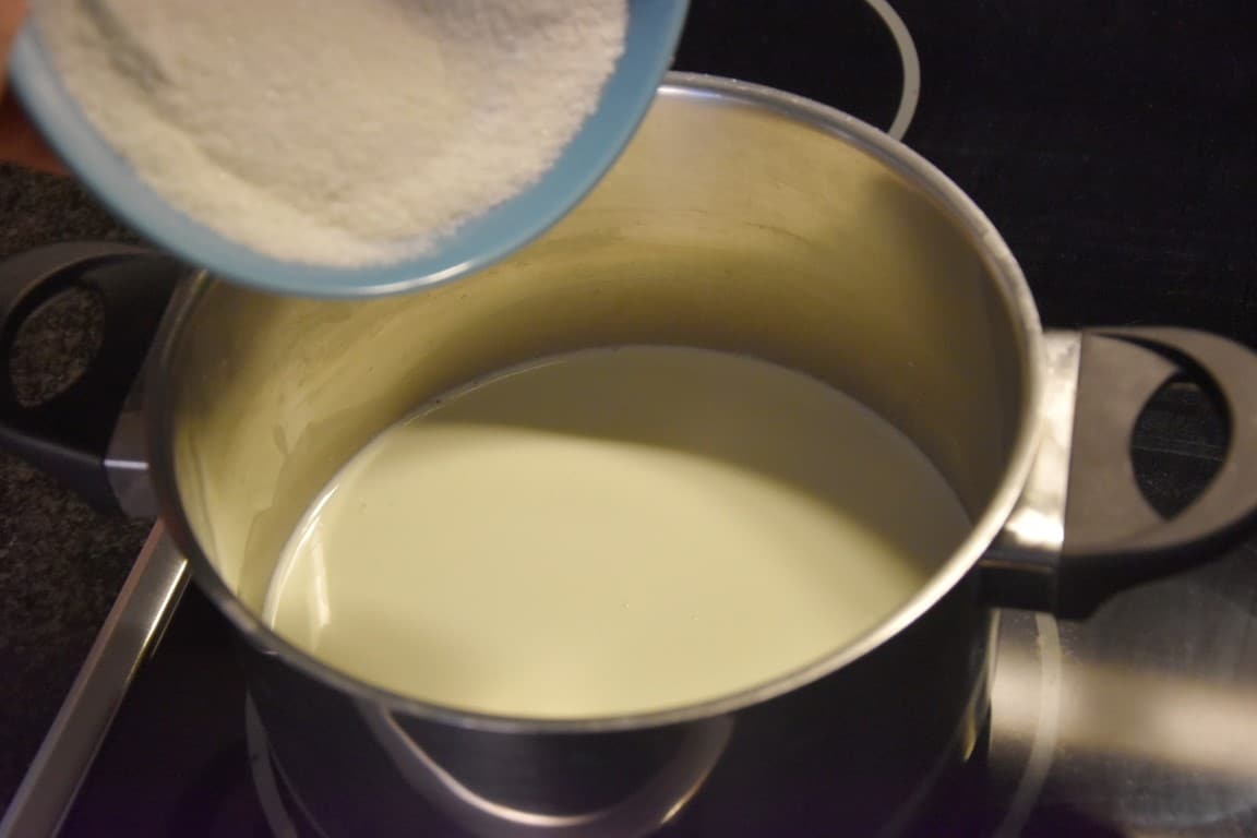 Unite panna e latte e mettete a scaldare in una casseruola. Unite le polveri (zuccheri, latte in polvere, neutro) e versatele a pioggia nei liquidi.